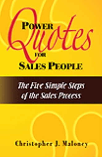 There are countless numbers of general quote books on the shelves, but no concise work exists that’s specifically targeted towards and deals with the important key areas of the actual sales process. That’s what Power Quotes for Sales People and the Five Simple Steps of the Sales Process has done. Simply put, this is the sales process taught by history’s most successful and powerful people. It’s a sales meeting hosted by Mark Twain or Confucius on the topic of Building Trust With Your Client. It’s a chalk-talk on Planning Your Presentation by Henry Thoreau, Sir Winston Churchill or the great American jazz composer Charles Mingus. It’s Time Management by Bruce Lee and Dressing for Success by Coco Chanel. Aristotle will motivate you to take action now while Casey Stengel and Oprah Winfrey will enlighten you on how to Build Your Sales Team. It’s Wayne Gretzky reminding you to ask for the order. That sure beats some boring automaton from “Corporate” droning on and on about something he doesn’t know how to do---close more sales right now! Power Quotes for Sales People is broken down into the Five Simple Steps of the Sales Process along with corresponding chapters that relate to each step and what you need to consider and work on in order to close more sales. These Power Quotes have been farmed, gathered and harvested from great works of literature, sports, business leaders, warriors, spiritual leaders, people who have overcome great hardships and tragedies, and from great salespeople themselves. To make that cut, they all in some way had to pitch and present themselves with enthusiasm. They too had to ask for the order, overcome objections and close someone on their idea, vision, concept or product. Many had to gain the public’s support to overcome impossible adversities and challenges. Simply put, If one well worded quote has positively changed the face, psyche and outcome of a nation, team, corporation or group of people living in despair, just imagine what Power Quotes for Sales People and the Five Simple Steps of the Sales Process can do for your selling career.