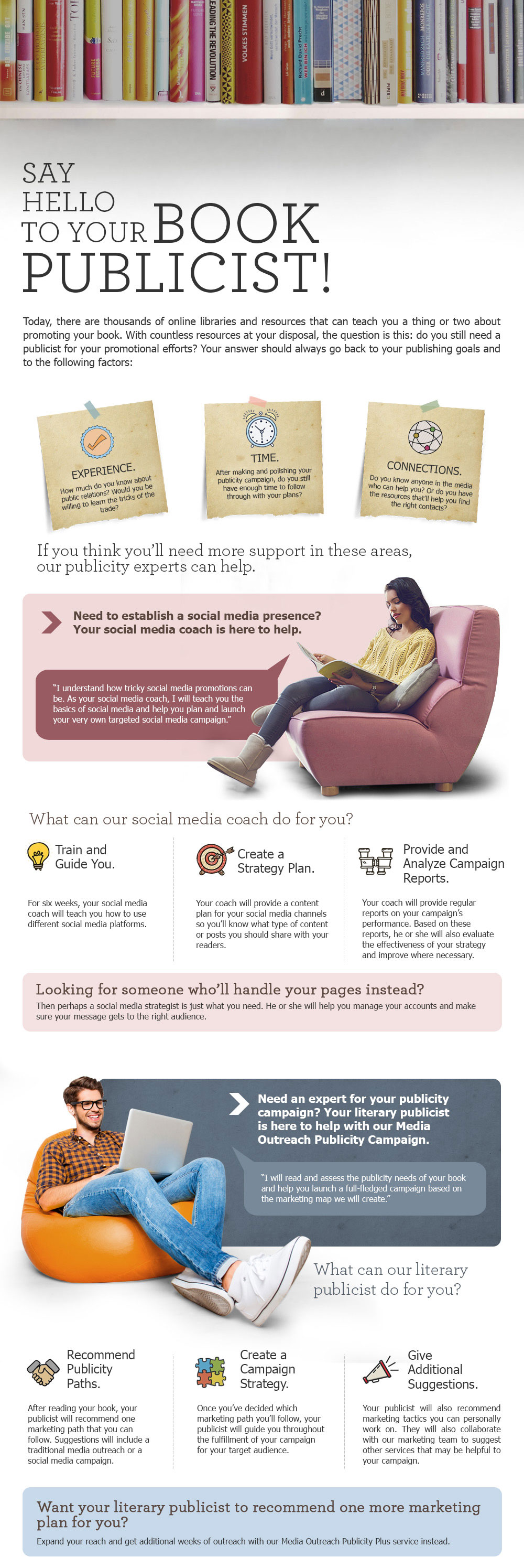 Do you need professional support for your publicity efforts? With our Publicity Campaigns, you’ll work with your very own publicist who’ll help you find and develop the right campaign for you and your book. Learn more by viewing our infographic below (or reading the transcript here).